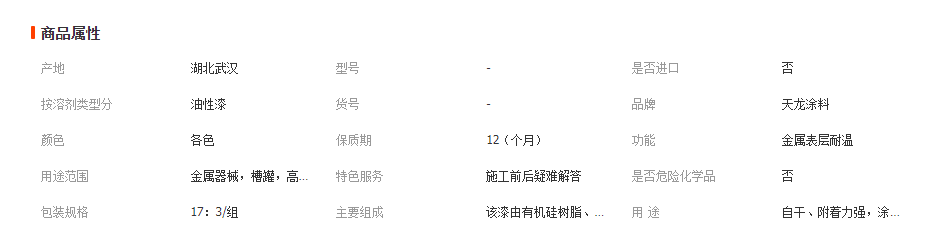 主要組成:該漆由有機硅樹脂、合成樹脂、耐高溫顏料、有機溶劑等組成的雙組份或單組份涂料。